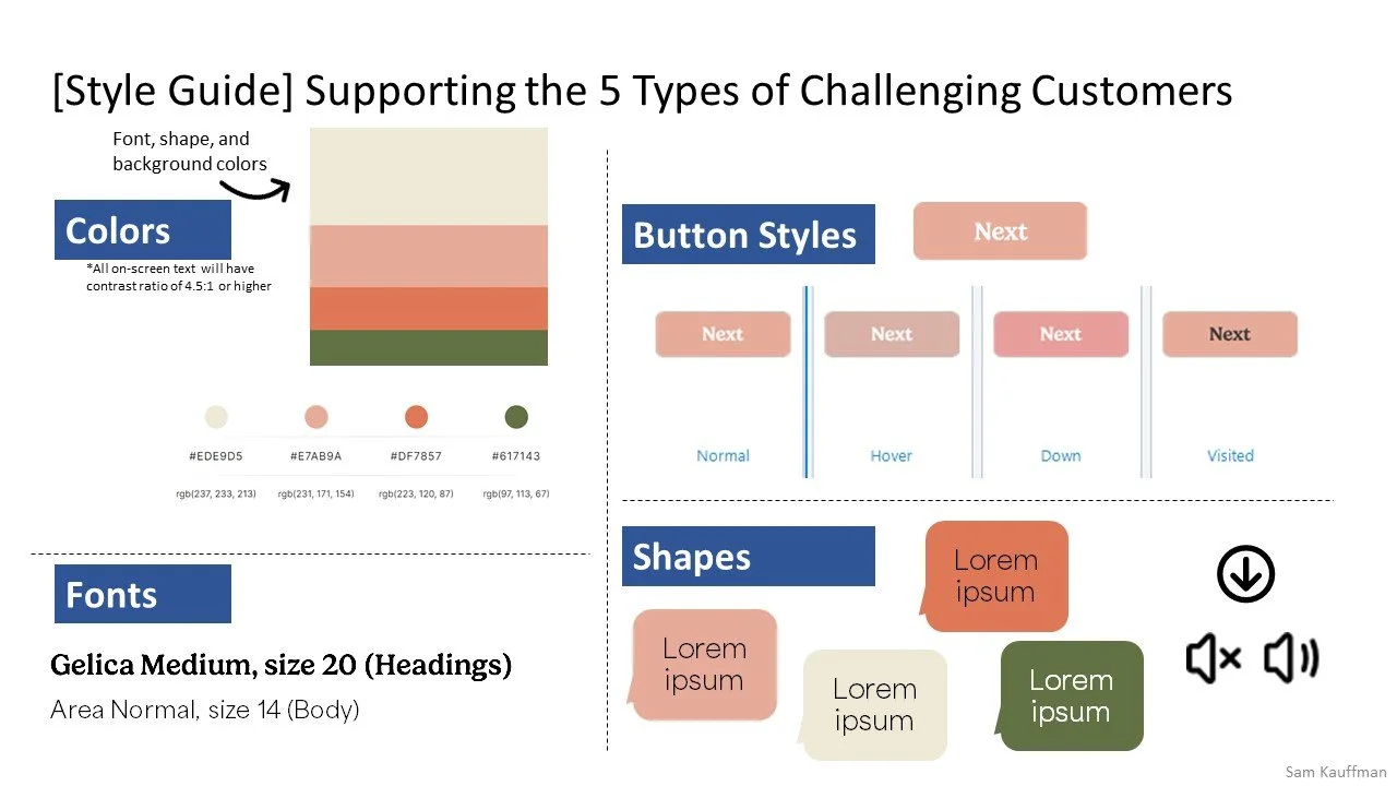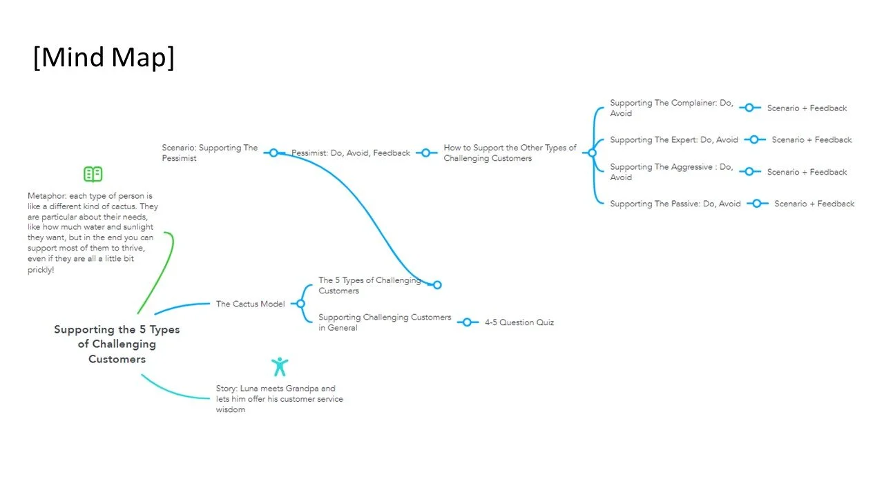 A visually appealing color palette and illustration of cacti tied to customer support immediately intrigue learners