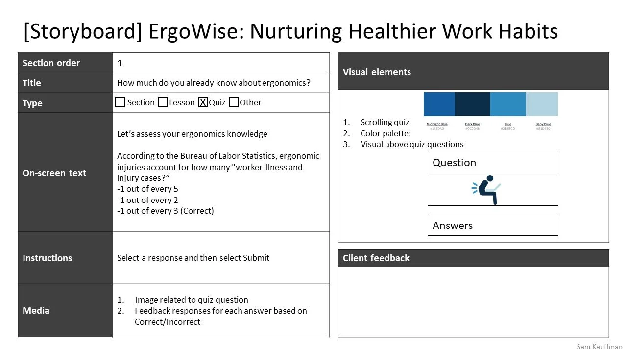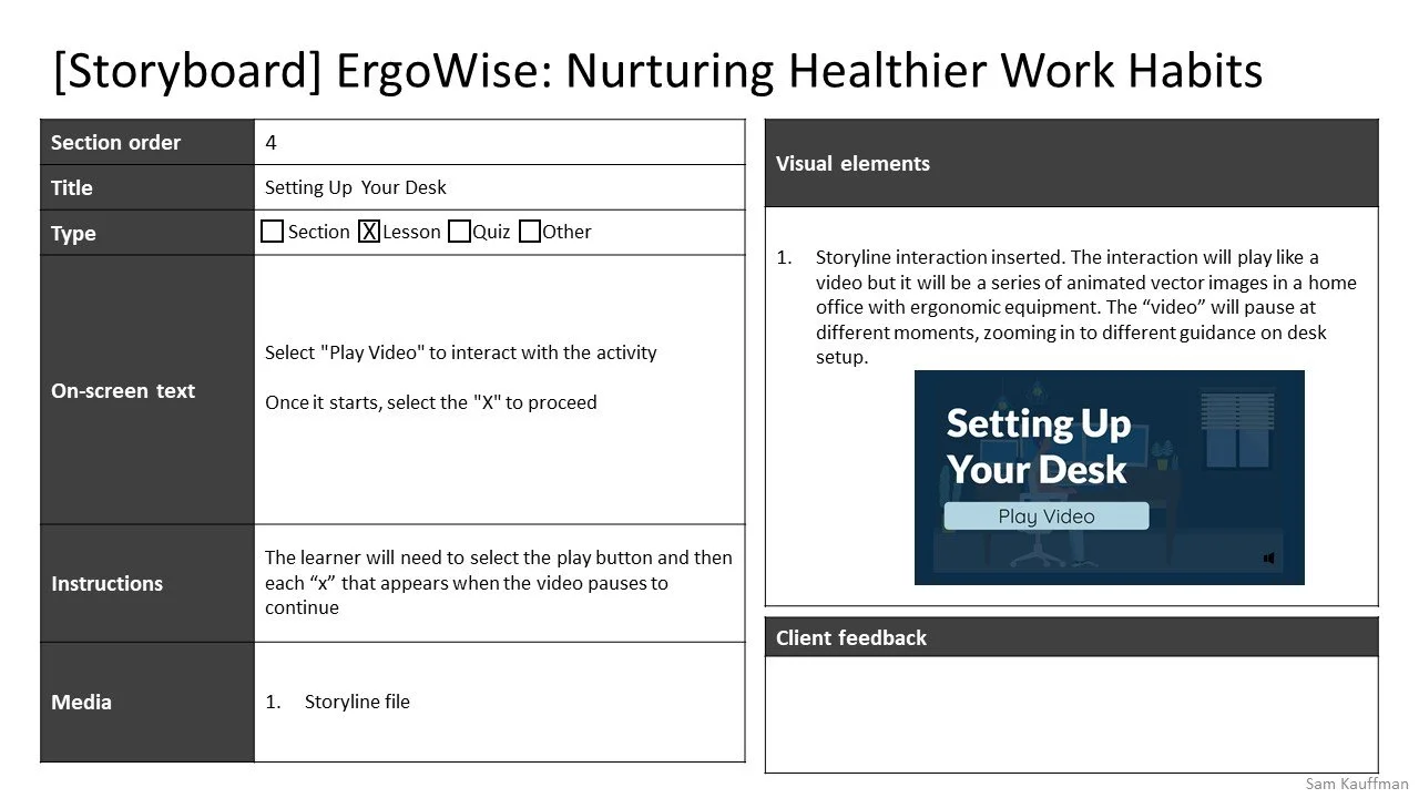 I connected with a former colleague who is a certified ergonomic specialist. He helped me identify the essential ergonomics advice all office-based workers should possess, which helped me plan the learning outcomes and assessments.