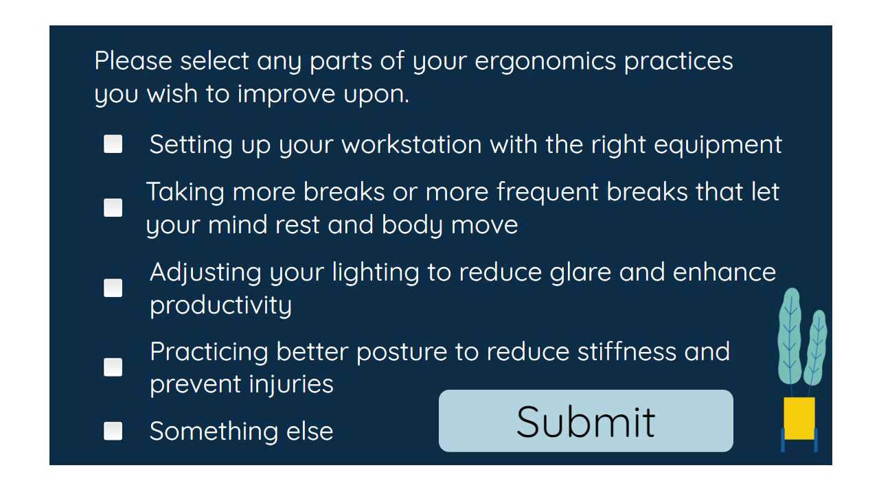 Learners must share an image of their desk setup and reflect on how to improve their ergonomics practices.