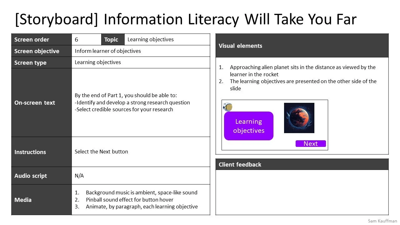 Because we wanted the course to be highly engaging, I sourced the vast majority of images of this alien planet from Midjourney, one of the leading AI-image generators. As I gathered my visual assets, I storyboarded the course and received feedback before diving in to Storyline.