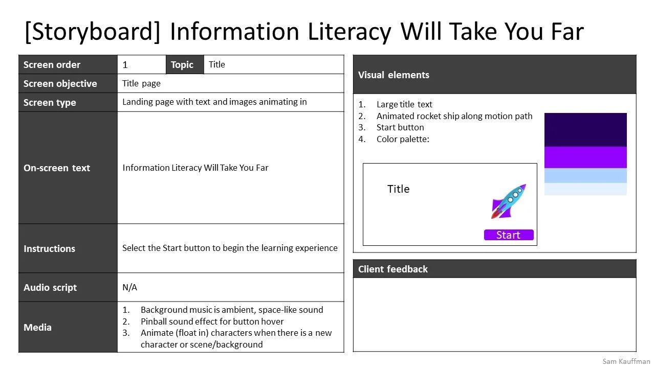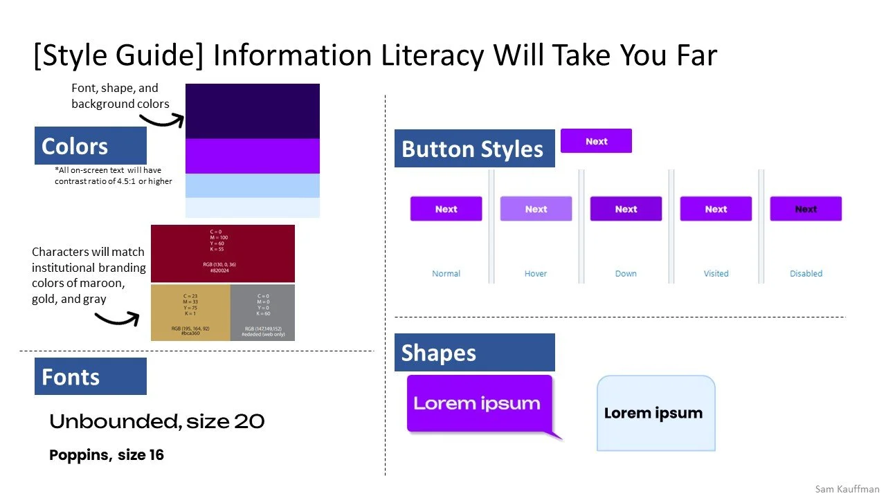 My first step was to craft the course’s learning objectives (shown below) and ensure my stakeholders agreed to them. Then, I established a style guide for color palettes and fonts before drafting any of the content.