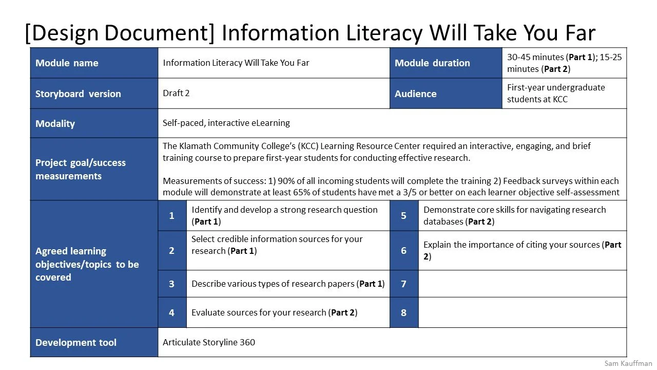 KCC’s Dean of Education and Librarian requested enhanced training for students on information literacy. After interviewing them and other faculty, I recommended an eLearning solution that could be delivered across desktop and mobile devices within KCC’s research and writing courses.